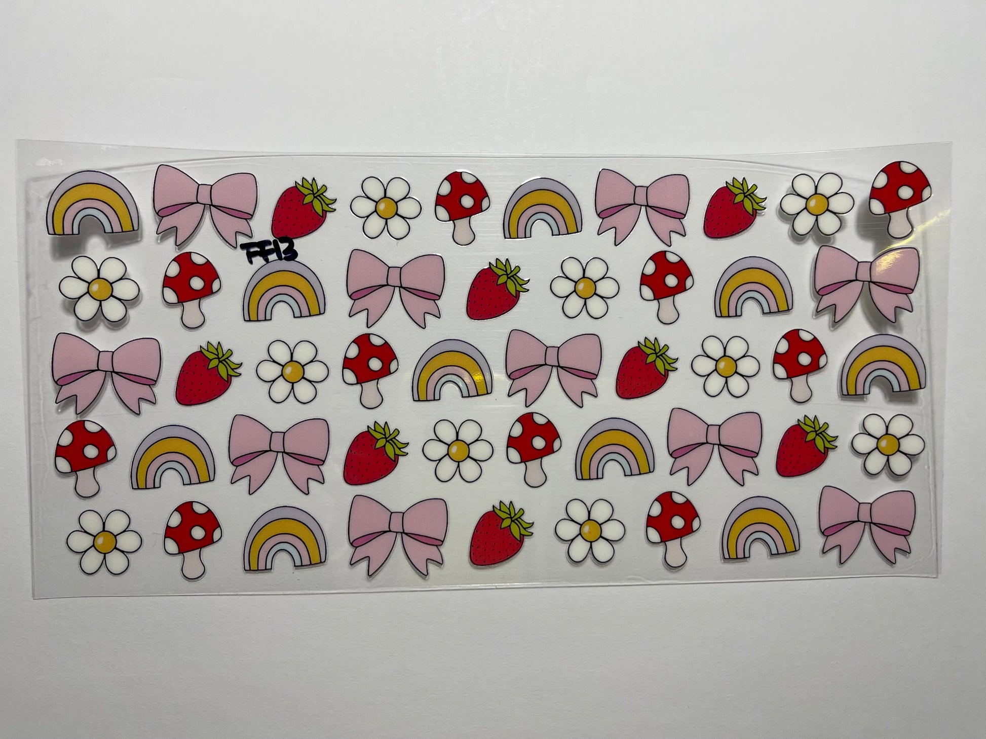 Strawberries, mushrooms, rainbows, white flowers and pink bows